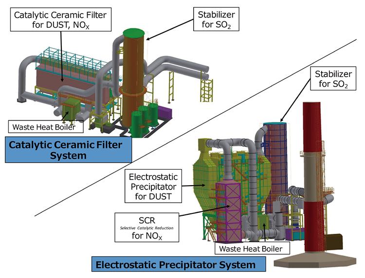 高温陶瓷催化滤管除尘的烟气净化的主体工艺路线为:小苏打/消石灰干粉喷射+脱硝还原剂(氨水)喷射+高温陶瓷催化滤管除尘器+引风机+烟囱,无须烟气再热系统。系统烟气排放指标可达到电力行业超净排放标准(粉尘≤10 mg/Nm3(最低可达到5 mg/Nm3以下),NOx≤50 mg/Nm3、SO2≤35